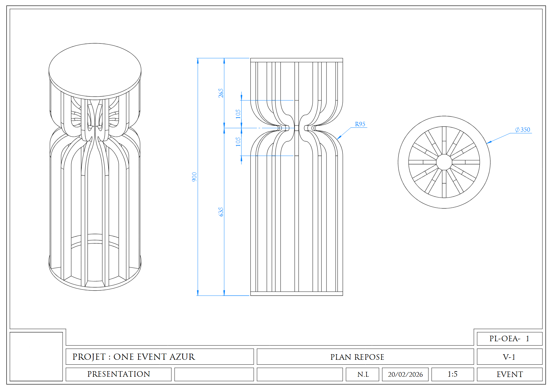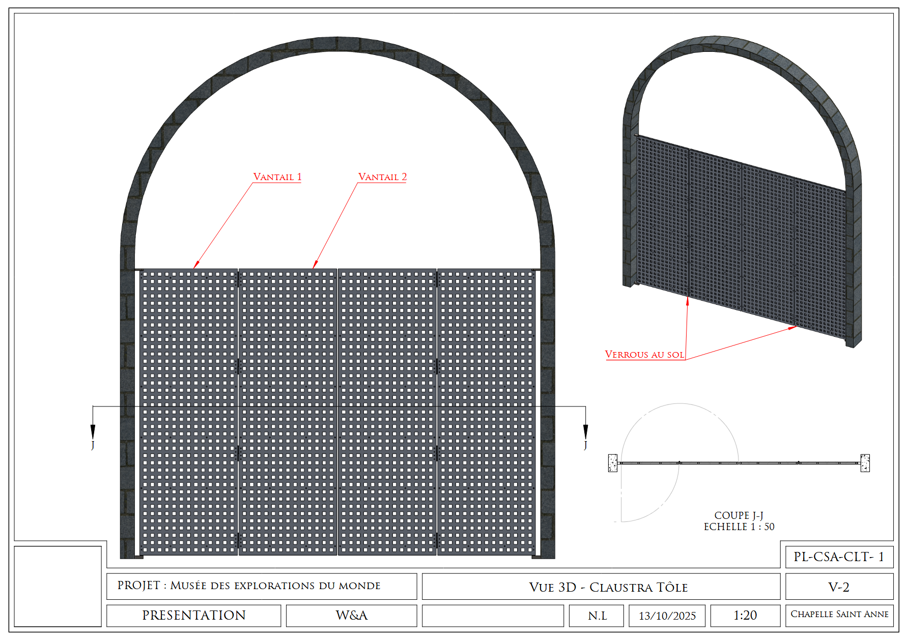 Plans de fabrication, plans d'ensemble, coupes et détails. Fichiers DWG/PDF prêts pour la production. Cotations normalisées, nomenclatures complètes.