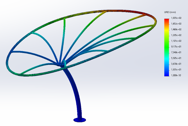 Structure ovale sur 5 pylônes, lames Red Cedar. 4 cas de charge Eurocodes. Flèche max 11,48mm pour limite 24mm. Pylônes largement sous-contraints.