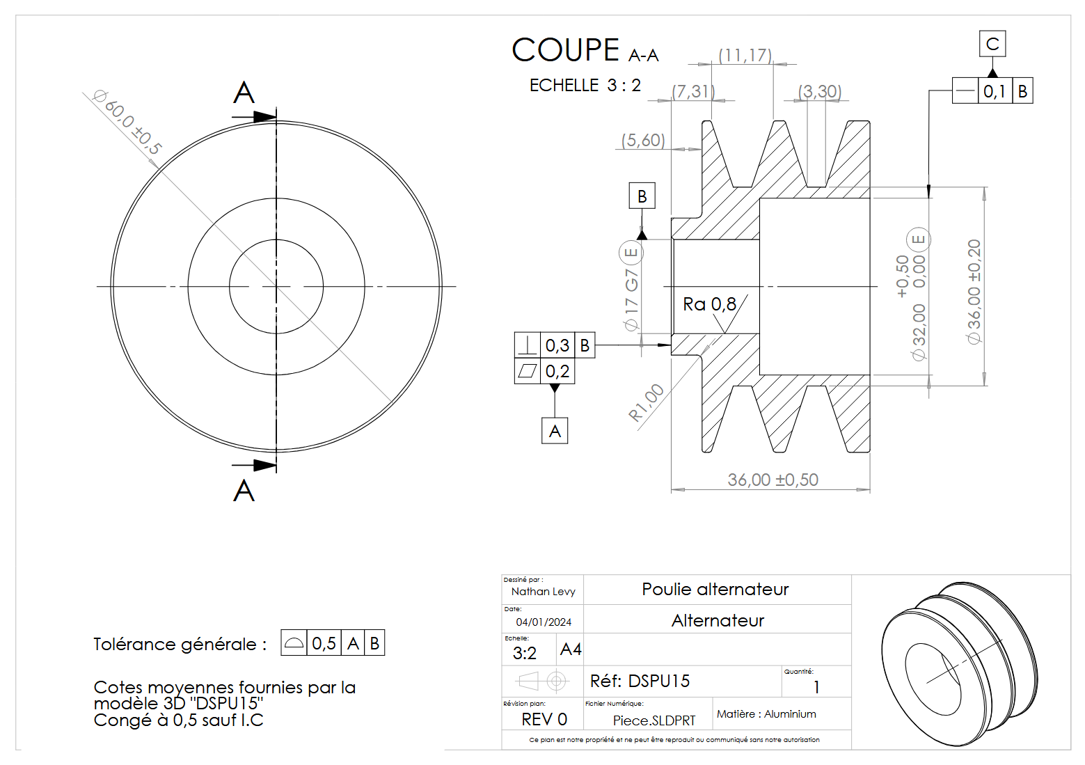 Plan destiné pour l'usinage au tour numérique dans un lopin en aluminium d'une poulie d'alternateur, cotation ISO.
